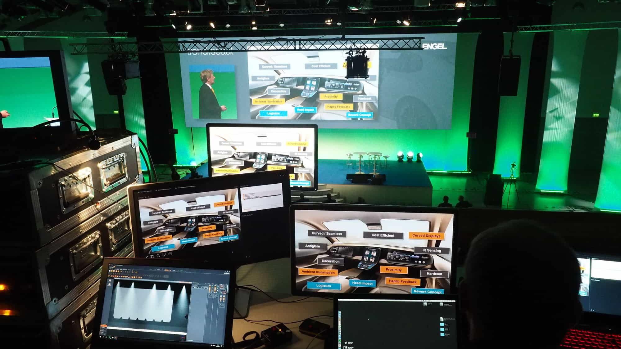 Rahmenlose Leinwände und gestochen scharfe Projektionen in verschiedensten Größen und Auflösungen sorgen für übersichtliche Darstellung Ihrer Präsentationen, welche als Powerpoint, Keynote oder Prezi wiedergegeben werden können. Für kleinere Präsentationsbereiche bieten wir LCD Bildschirm-Lösungen in allen Größen an. Außerdem eignen sich unsere Multimedia-Redner*innenpulte perfekt für digitale Namens- & Logo-Einblendungen und lassen sich durch Gobo-Projektionen nach Belieben Ihrer Brand anpassen.